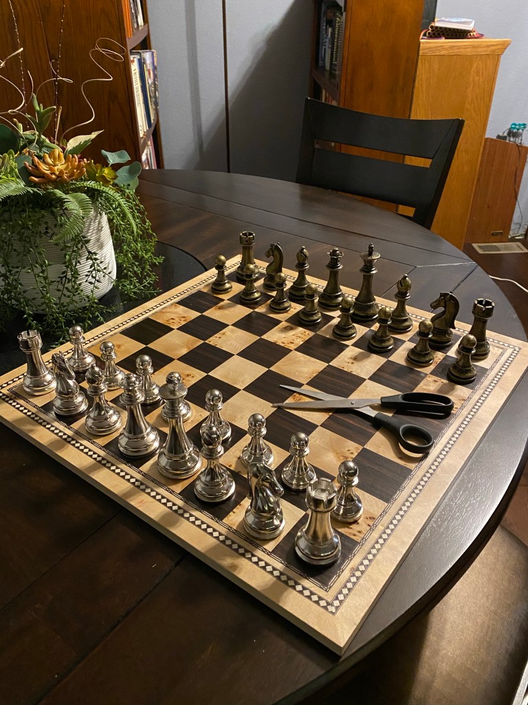 I love the game of chess, I have collected chess boards and pieces for decades. My small collection is diverse and eclectic as I am.
